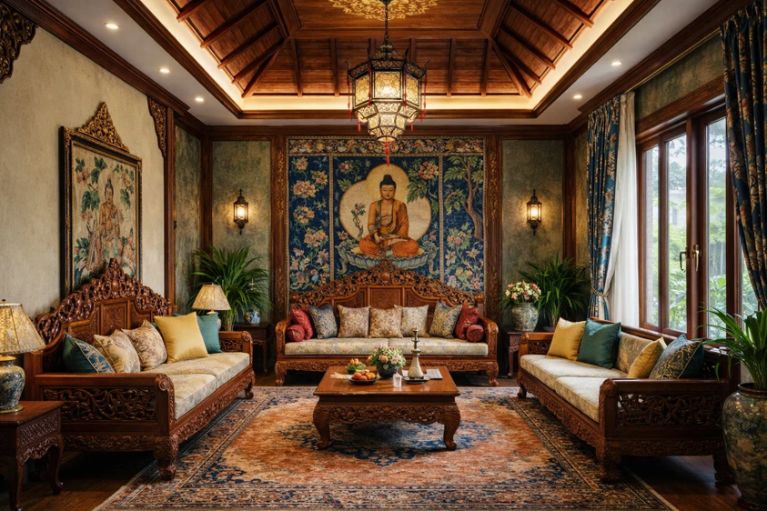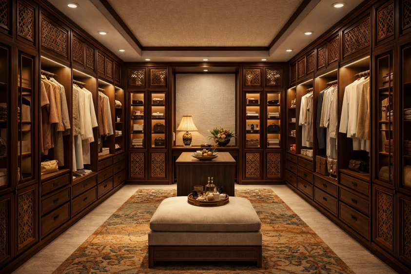 实木雕花柜门、复古地毯与暖调灯光,与东南亚精致典雅的风格高度契合,避免杂乱感。