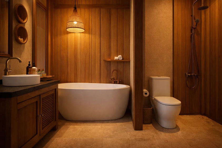 暖木色与柔和灯光营造出温馨治愈的沐浴氛围,兼具度假感与舒适感。