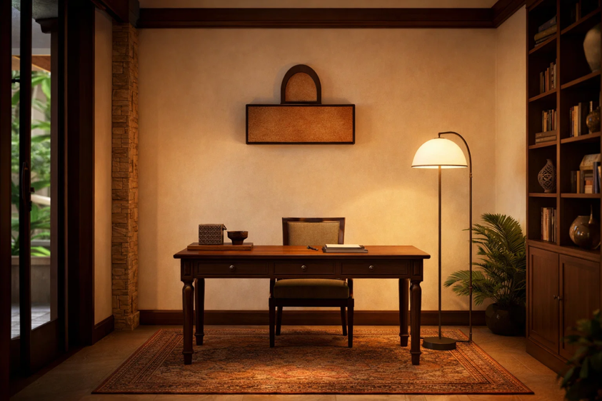 暖木色与柔和灯光营造出温馨静谧的办公氛围,兼具仪式感与舒适感。