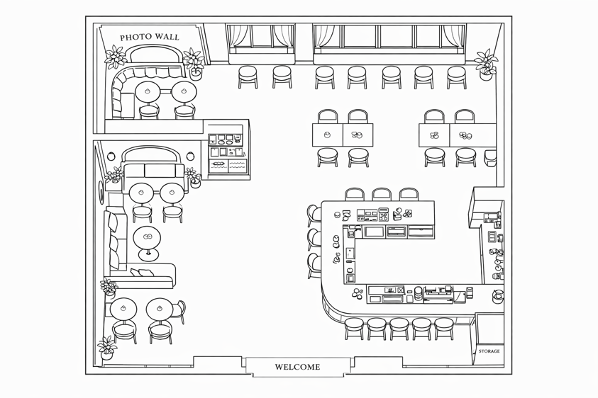 的商业逻辑,合理规划打卡区、客区、吧台与后勤区,最大化空间利用率。通过网红打卡墙、