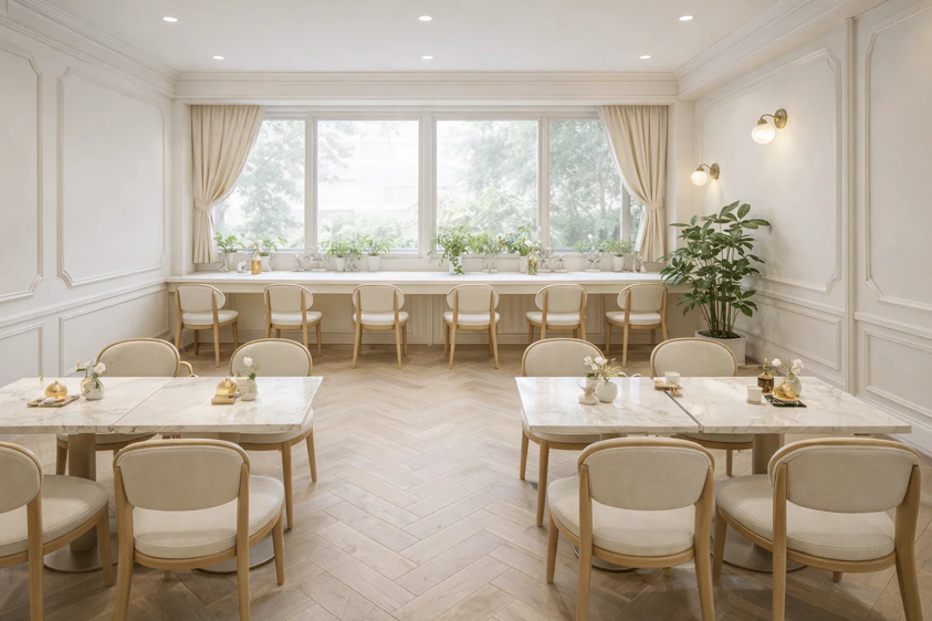 靠窗高脚座与前方方桌区有序划分,满足单人办公与多人小聚的多元需求,客流动线互不干扰。