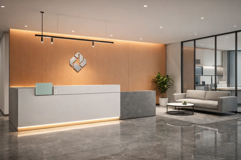 大理石地面耐磨易清洁,适配高频人流;木饰面背景柔化空间,兼顾办公场景的专业感与温度。