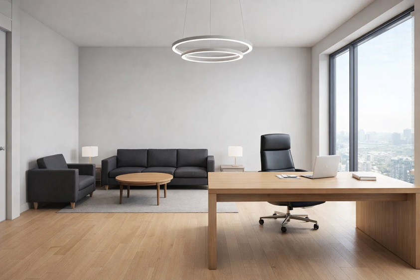 大面积落地窗引入充足自然光,环形吊灯提供均匀照明,营造明亮高效的办公氛围。