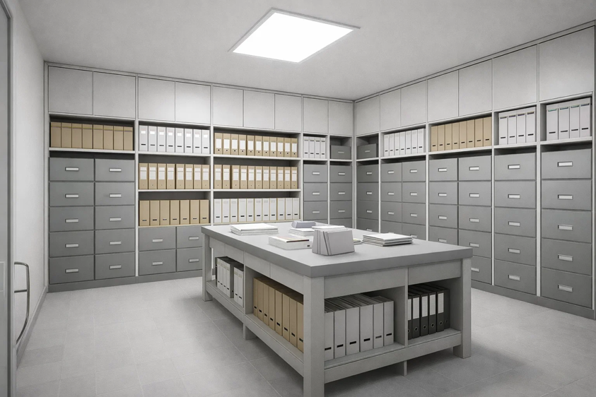 浅灰主色调 + 顶光照明,无冗余装饰,营造出规整、严谨的档案管理环境。