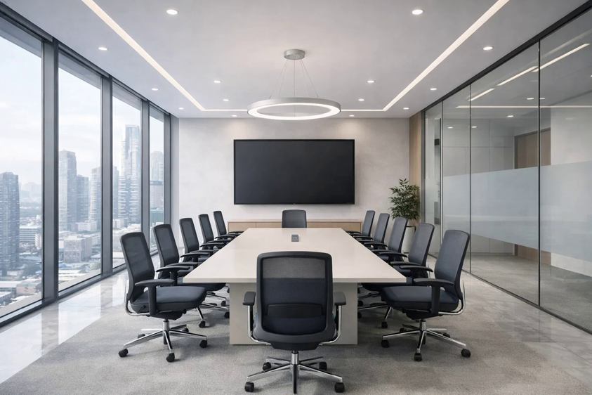 浅灰调硬装 + 极简家具,线条利落,视觉整洁大气,契合现代商务办公的专业形象。