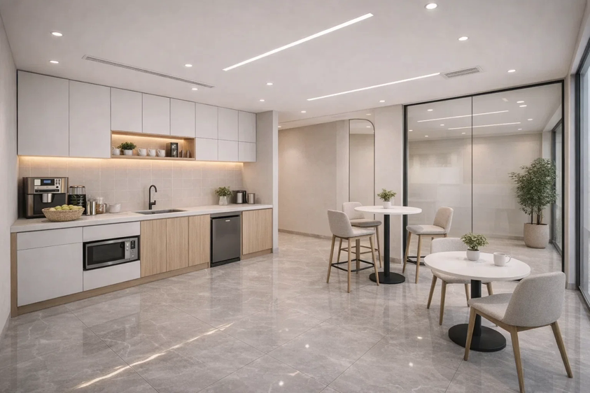 水吧操作区与休闲用餐区独立划分,动线流畅,员工取水、用餐互不干扰,适配办公场景需求。