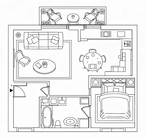沙发、单人椅、茶几形成围合式会客区,兼顾交流与休憩,右侧预留用餐区,功能分区清晰,行走动线流畅。