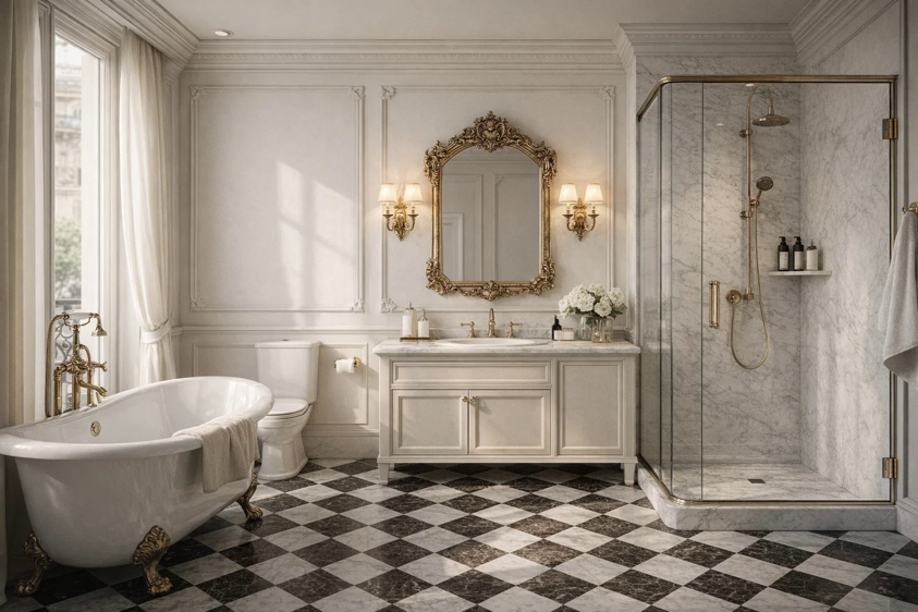 法式古典元素与大理石、黑白格地砖结合,营造出优雅精致的视觉质感,兼具复古感与现代整洁度。
