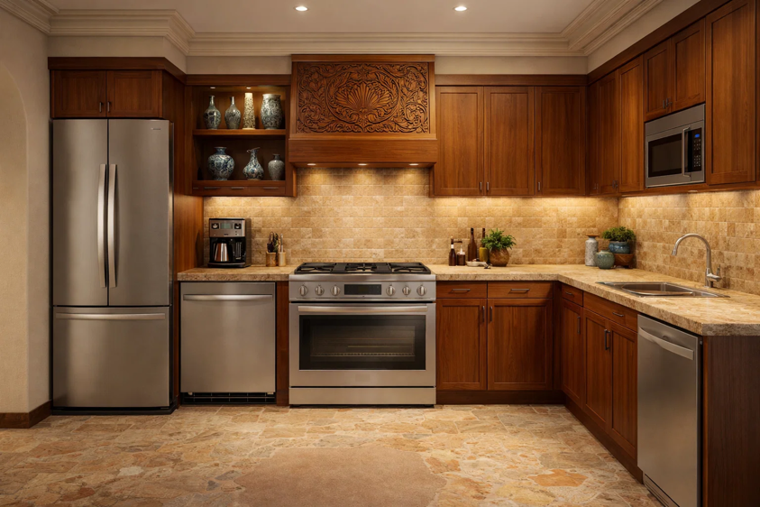 实木橱柜与东南亚风格的木雕装饰相得益彰,搭配暖调石材台面与瓷砖,整体风格协调统一。