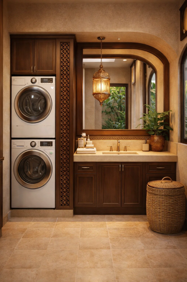 实木雕花柜门、复古地毯与暖调灯光,与东南亚精致典雅的风格高度契合,避免杂乱感。