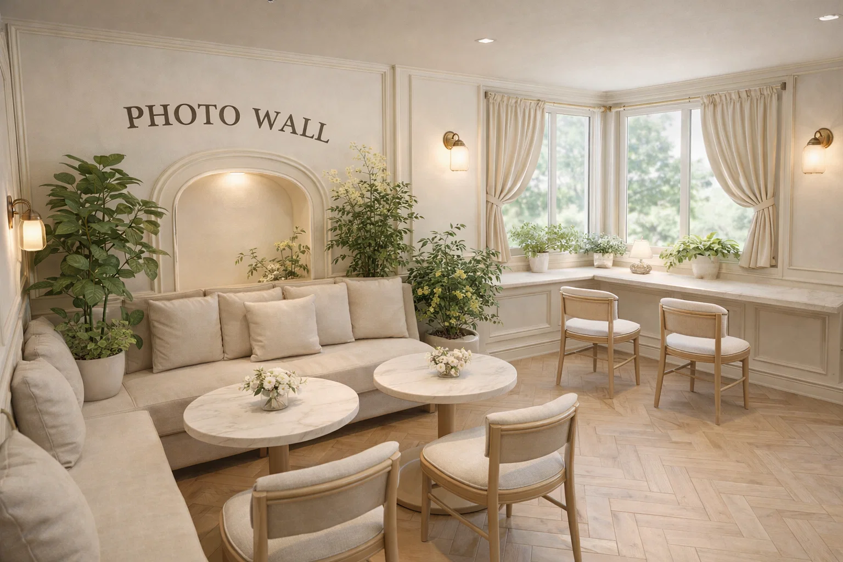 “PHOTO WALL” 与绿植造景强化打卡属性,软包沙发 + 矮桌提升久坐舒适度,适合轻社交与拍照分享。