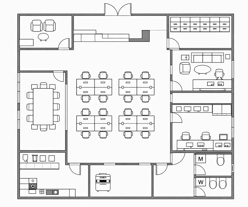 办公区、会客区与储物区沿墙面有序分布,动线流畅,满足办公、接待与收纳的多元需求。