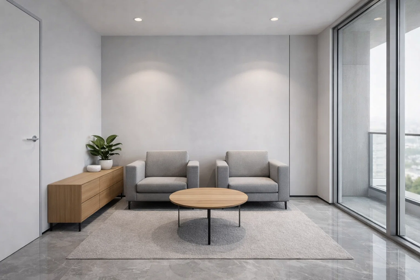 浅灰家具与木色柜体搭配柔和灯光,大面积落地窗引入自然光,营造通透放松的洽谈氛围。