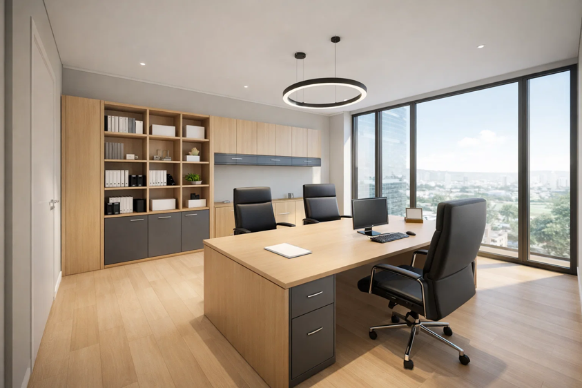浅木色与深灰搭配,线条利落无冗余装饰,既显专业稳重,又符合现代办公的极简审美。