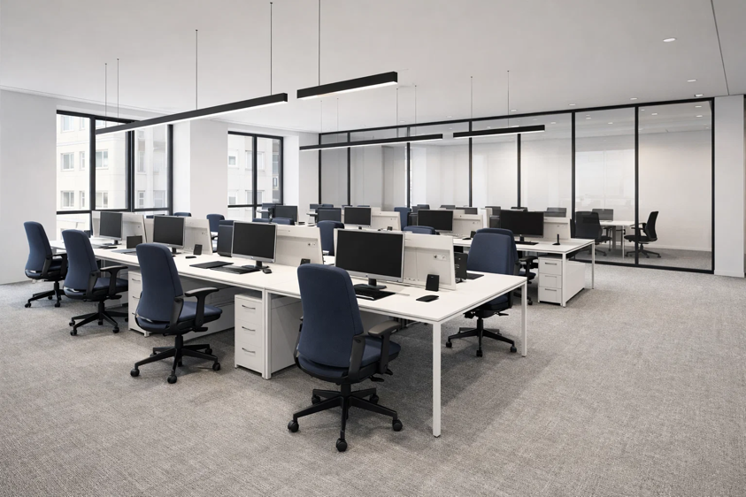 侧窗引入自然光,线性吊灯提供均匀补光,避免局部阴影,提升办公舒适度。