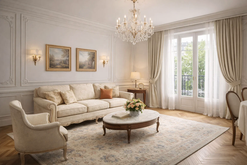 法式护墙板、雕花家具与水晶吊灯呼应,浅米色调+柔和软装,营造出温柔复古的优雅氛围,视觉和谐舒适。