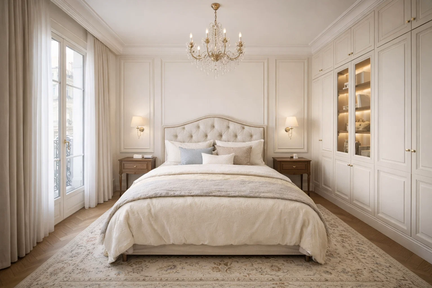法式护墙板、软包床头与黄铜五金呼应,浅米色调 + 柔和软装,营造出静谧优雅的睡眠氛围,视觉舒适且富有复古质感。