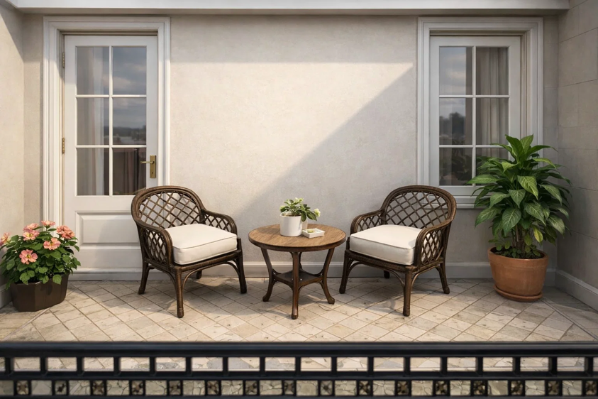 双人对坐的藤椅 + 小茶几形成核心休闲区,动线简洁,适合小阳台使用。